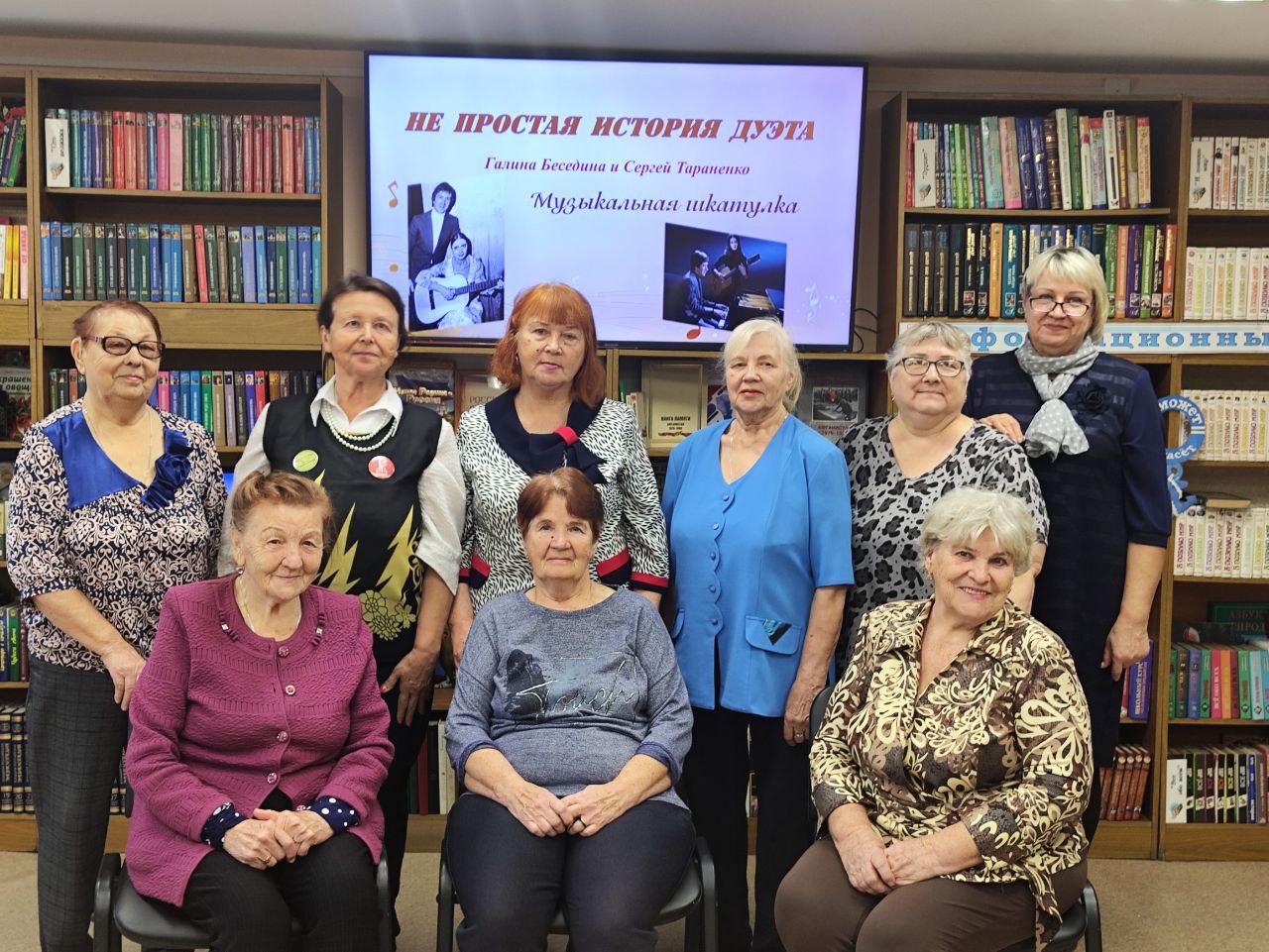 Музыкальная шкатулка «Непростая история дуэта» 21 октября детская библиотека «Колмогоровская» гостеприимно распахнула двери перед участниками клуба ветеранов «Мудрость и креатив», пригласив их окунуться в мир творчества известного российского дуэта — Галины Бесединой и Сергея Тараненко. Гостям была представлена уникальная возможность услышать трогательные истории, лежащие в основе творческого пути двух талантливых музыкантов, чьи голоса звучат в сердцах многих поколений россиян. Ведущая познакомила участников встречи с историей становления дуэта, напомнив яркие моменты совместного творчества. Затем участники погрузились в атмосферу музыки, послушав знаменитые хиты, ставшие визитной карточкой пары: композицию «Маленький принц», песню «Мне нравится» и проникновенную балладу «Не исчезай». |